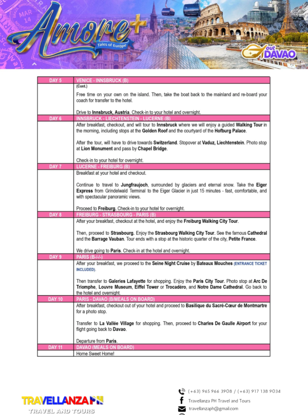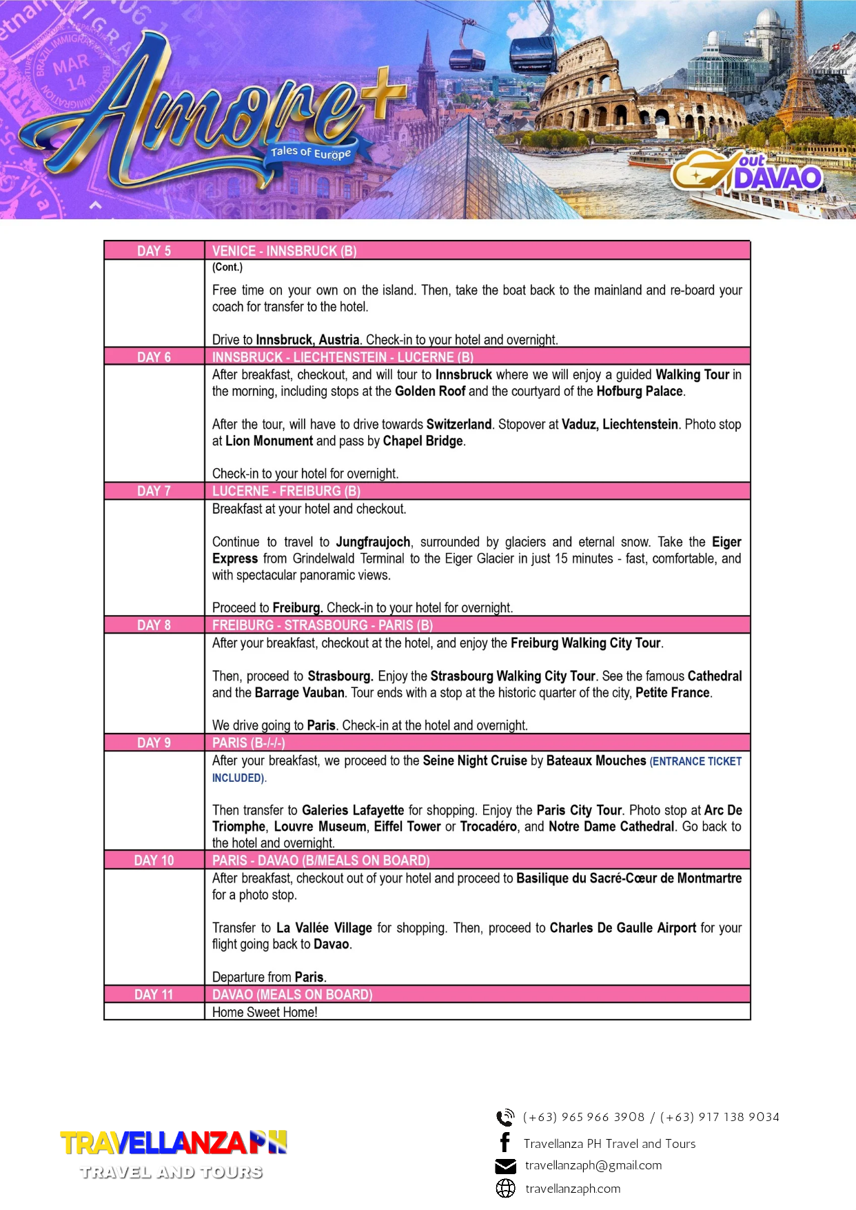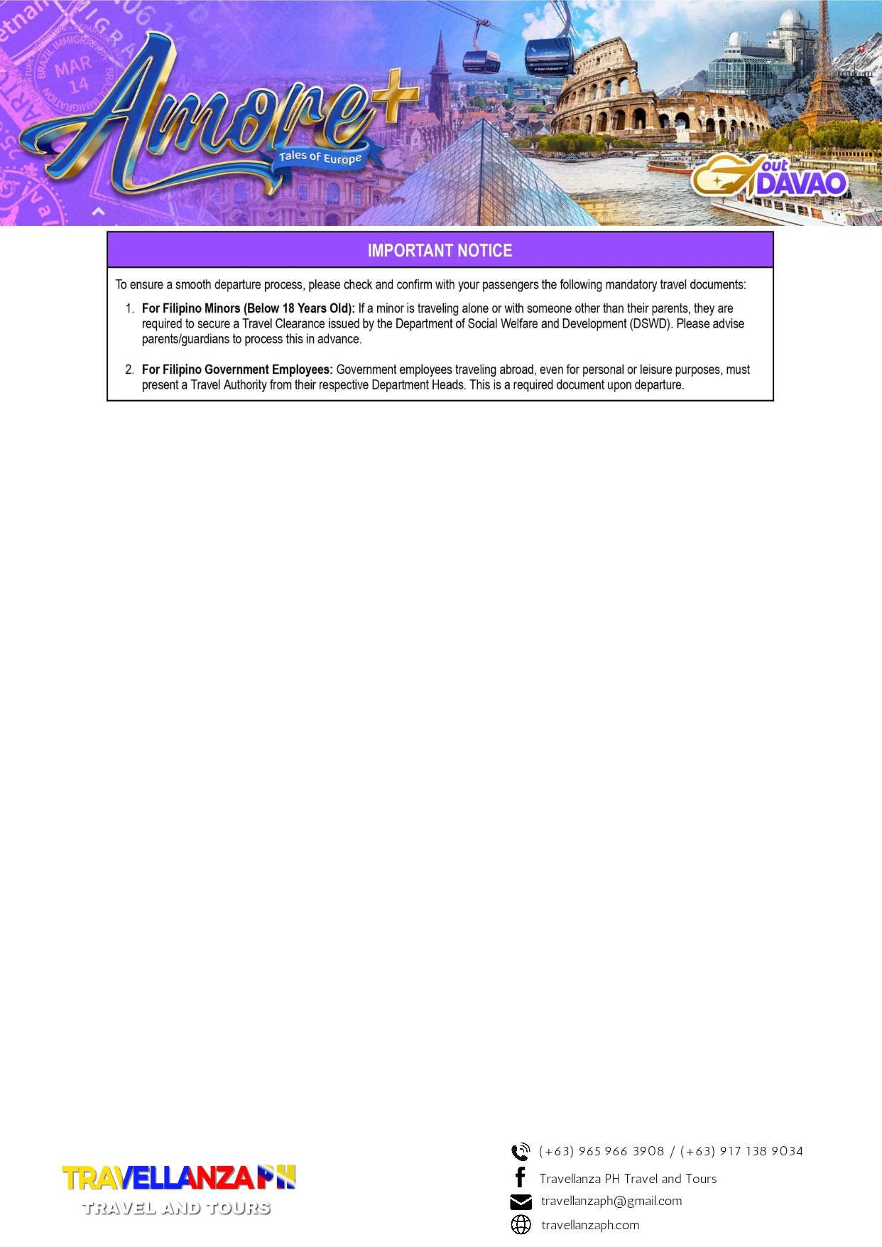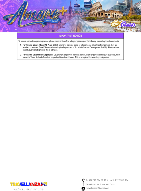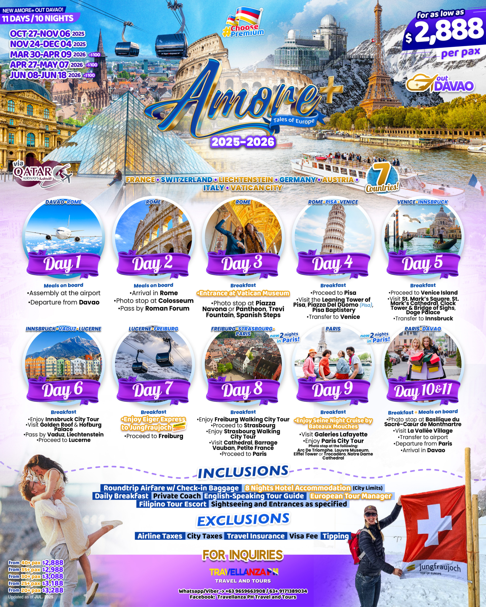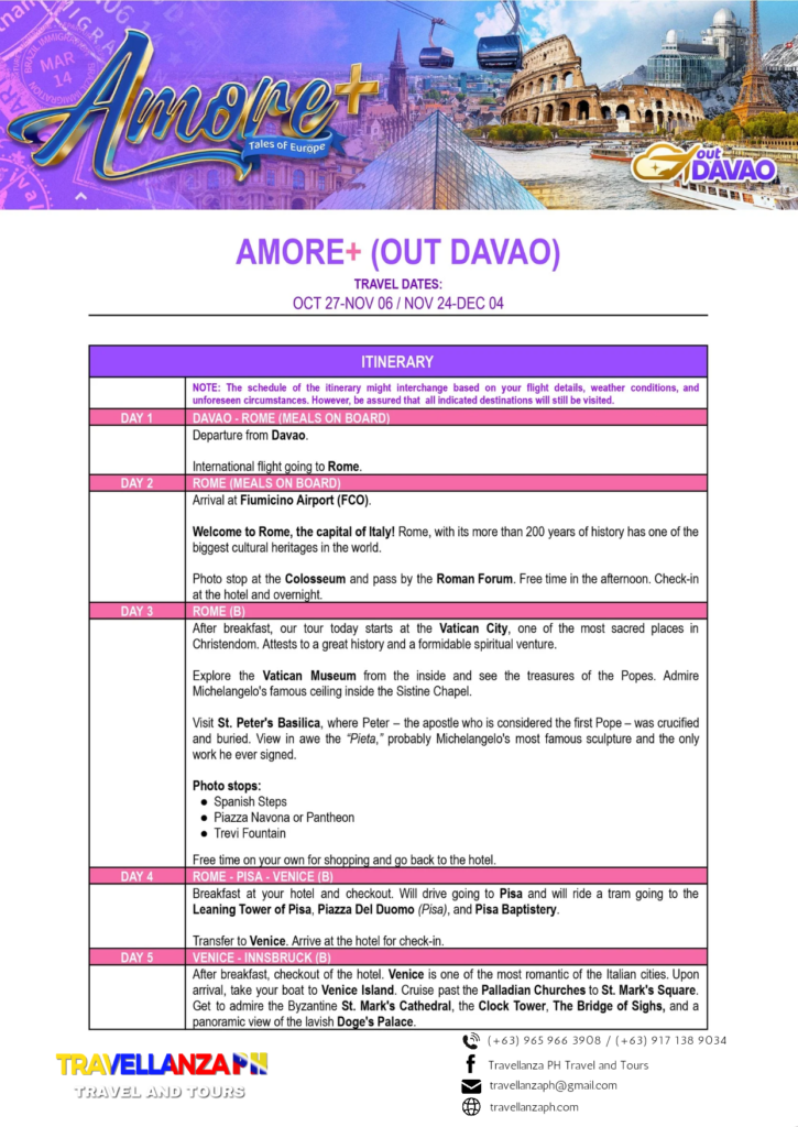 Amore + Out Davao 11 Days 10 Nights Overview Overview Go and book your Tour now! Month of Availability!March 30 - April 09 2026 +$100 April 27 - May 07 2026 +$100June 08 - June 18 2026 +$100 Date & Time Package Type Back Continue You can send your enquiry via the form below. Trip name: * Amore + Out Davao Your name: * Your email: * Country * Choose a country*AfghanistanĂ…land IslandsAlbaniaAlgeriaAmerican SamoaAndorraAngolaAnguillaAntarcticaAntigua and BarbudaArgentinaArmeniaArubaAustraliaAustriaAzerbaijanBahamasBahrainBangladeshBarbadosBelarusBelgiumBelauBelizeBeninBermudaBhutanBoliviaBonaire, Saint Eustatius and SabaBosnia and HerzegovinaBotswanaBouvet IslandBrazilBritish Indian Ocean TerritoryBruneiBulgariaBurkina FasoBurundiCambodiaCameroonCanadaCape VerdeCayman IslandsCentral African RepublicChadChileChinaChristmas IslandCocos (Keeling) IslandsColombiaComorosCongo (Brazzaville)Congo (Kinshasa)Cook IslandsCosta RicaCroatiaCubaCuraçaoCyprusCzech RepublicDenmarkDjiboutiDominicaDominican RepublicEcuadorEgyptEl SalvadorEquatorial GuineaEritreaEstoniaEthiopiaFalkland IslandsFaroe IslandsFijiFinlandFranceFrench GuianaFrench PolynesiaFrench Southern TerritoriesGabonGambiaGeorgiaGermanyGhanaGibraltarGreeceGreenlandGrenadaGuadeloupeGuamGuatemalaGuernseyGuineaGuinea-BissauGuyanaHaitiHeard Island and McDonald IslandsHondurasHong KongHungaryIcelandIndiaIndonesiaIranIraqIrelandIsle of ManIsraelItalyIvory CoastJamaicaJapanJerseyJordanKazakhstanKenyaKiribatiKuwaitKyrgyzstanLaosLatviaLebanonLesothoLiberiaLibyaLiechtensteinLithuaniaLuxembourgMacaoNorth MacedoniaMadagascarMalawiMalaysiaMaldivesMaliMaltaMarshall IslandsMartiniqueMauritaniaMauritiusMayotteMexicoMicronesiaMoldovaMonacoMongoliaMontenegroMontserratMoroccoMozambiqueMyanmarNamibiaNauruNepalNetherlandsNew CaledoniaNew ZealandNicaraguaNigerNigeriaNiueNorfolk IslandNorthern Mariana IslandsNorth KoreaNorwayOmanPakistanPalestinian TerritoryPanamaPapua New GuineaParaguayPeruPhilippinesPitcairnPolandPortugalPuerto RicoQatarReunionRomaniaRussiaRwandaSaint BarthélemySaint HelenaSaint Kitts and NevisSaint LuciaSaint Martin (French part)Saint Martin (Dutch part)Saint Pierre and MiquelonSaint Vincent and the GrenadinesSan MarinoSão Tomé and PríncipeSaudi ArabiaSenegalSerbiaSeychellesSierra LeoneSingaporeSlovakiaSloveniaSolomon IslandsSomaliaSouth AfricaSouth Georgia/Sandwich IslandsSouth KoreaSouth SudanSpainSri LankaSudanSurinameSvalbard and Jan MayenSwazilandSwedenSwitzerlandSyriaTaiwanTajikistanTanzaniaThailandTimor-LesteTogoTokelauTongaTrinidad and TobagoTunisiaTurkeyTurkmenistanTurks and Caicos IslandsTuvaluUgandaUkraineUnited Arab EmiratesUnited Kingdom (UK)United States (US)United States (US) Minor Outlying IslandsUruguayUzbekistanVanuatuVaticanVenezuelaVietnamVirgin Islands (British)Virgin Islands (US)Wallis and FutunaWestern SaharaSamoaYemenZambiaZimbabwe Contact number: * No. of Adults * No. of children Enquiry Subject: * Your Message * Show Prices From ₱170,219 / Rate Best Price GuaranteedNo Booking FeesProfessional Local Guide Check Availability ArchivesNo archives to show.CategoriesNo categoriesFeatured Trips ₱1,200 BORACAY ISLAND HOPPING Boracay, Philippines, Daily Tours, Packages 8 Hours ₱2,600 UNDERGROUND RIVER Daily Tours, Puerto princesa city, Palawan 8 Hours ₱2,700 CALAUIT SAFARI WITH BLACK ISLAND TOUR Coron, Palawan, Daily Tours 8 Hours