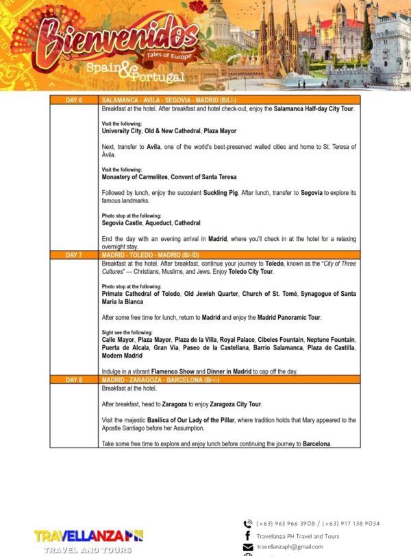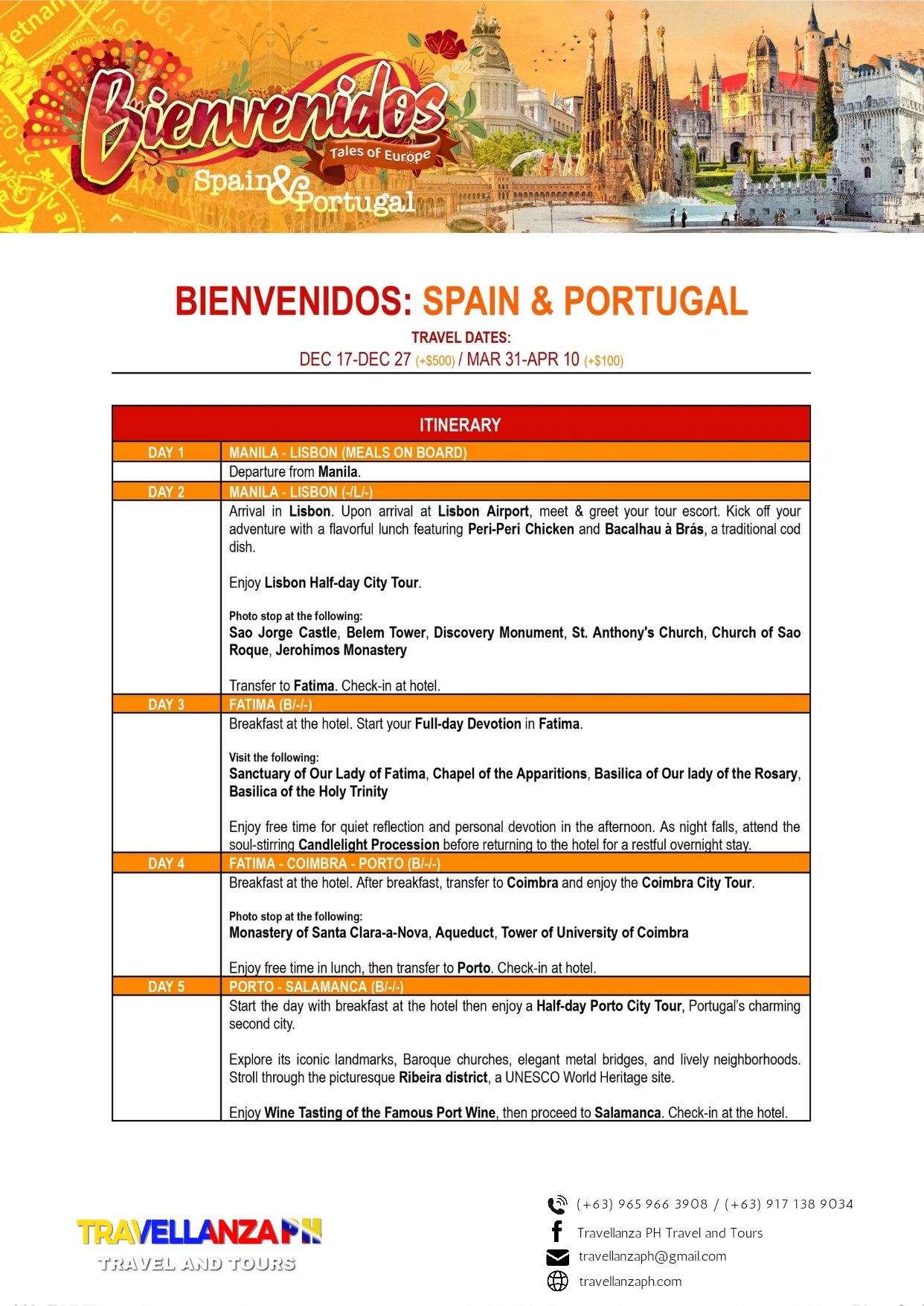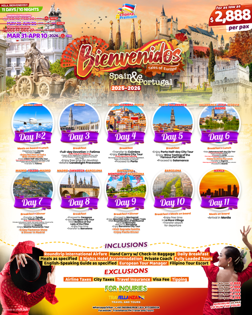Bienvenidos 11 Days 10 Nights Overview Overview Go and book your Tour now! Month of Availability!March 31 - April 10 2026 +$100 Date & Time Package Type Back Continue You can send your enquiry via the form below. Trip name: * Bienvenidos Your name: * Your email: * Country * Choose a country*AfghanistanĂ…land IslandsAlbaniaAlgeriaAmerican SamoaAndorraAngolaAnguillaAntarcticaAntigua and BarbudaArgentinaArmeniaArubaAustraliaAustriaAzerbaijanBahamasBahrainBangladeshBarbadosBelarusBelgiumBelauBelizeBeninBermudaBhutanBoliviaBonaire, Saint Eustatius and SabaBosnia and HerzegovinaBotswanaBouvet IslandBrazilBritish Indian Ocean TerritoryBruneiBulgariaBurkina FasoBurundiCambodiaCameroonCanadaCape VerdeCayman IslandsCentral African RepublicChadChileChinaChristmas IslandCocos (Keeling) IslandsColombiaComorosCongo (Brazzaville)Congo (Kinshasa)Cook IslandsCosta RicaCroatiaCubaCuraçaoCyprusCzech RepublicDenmarkDjiboutiDominicaDominican RepublicEcuadorEgyptEl SalvadorEquatorial GuineaEritreaEstoniaEthiopiaFalkland IslandsFaroe IslandsFijiFinlandFranceFrench GuianaFrench PolynesiaFrench Southern TerritoriesGabonGambiaGeorgiaGermanyGhanaGibraltarGreeceGreenlandGrenadaGuadeloupeGuamGuatemalaGuernseyGuineaGuinea-BissauGuyanaHaitiHeard Island and McDonald IslandsHondurasHong KongHungaryIcelandIndiaIndonesiaIranIraqIrelandIsle of ManIsraelItalyIvory CoastJamaicaJapanJerseyJordanKazakhstanKenyaKiribatiKuwaitKyrgyzstanLaosLatviaLebanonLesothoLiberiaLibyaLiechtensteinLithuaniaLuxembourgMacaoNorth MacedoniaMadagascarMalawiMalaysiaMaldivesMaliMaltaMarshall IslandsMartiniqueMauritaniaMauritiusMayotteMexicoMicronesiaMoldovaMonacoMongoliaMontenegroMontserratMoroccoMozambiqueMyanmarNamibiaNauruNepalNetherlandsNew CaledoniaNew ZealandNicaraguaNigerNigeriaNiueNorfolk IslandNorthern Mariana IslandsNorth KoreaNorwayOmanPakistanPalestinian TerritoryPanamaPapua New GuineaParaguayPeruPhilippinesPitcairnPolandPortugalPuerto RicoQatarReunionRomaniaRussiaRwandaSaint BarthélemySaint HelenaSaint Kitts and NevisSaint LuciaSaint Martin (French part)Saint Martin (Dutch part)Saint Pierre and MiquelonSaint Vincent and the GrenadinesSan MarinoSão Tomé and PríncipeSaudi ArabiaSenegalSerbiaSeychellesSierra LeoneSingaporeSlovakiaSloveniaSolomon IslandsSomaliaSouth AfricaSouth Georgia/Sandwich IslandsSouth KoreaSouth SudanSpainSri LankaSudanSurinameSvalbard and Jan MayenSwazilandSwedenSwitzerlandSyriaTaiwanTajikistanTanzaniaThailandTimor-LesteTogoTokelauTongaTrinidad and TobagoTunisiaTurkeyTurkmenistanTurks and Caicos IslandsTuvaluUgandaUkraineUnited Arab EmiratesUnited Kingdom (UK)United States (US)United States (US) Minor Outlying IslandsUruguayUzbekistanVanuatuVaticanVenezuelaVietnamVirgin Islands (British)Virgin Islands (US)Wallis and FutunaWestern SaharaSamoaYemenZambiaZimbabwe Contact number: * No. of Adults * No. of children Enquiry Subject: * Your Message * Show Prices From ₱170,219 / Rate Best Price GuaranteedNo Booking FeesProfessional Local Guide Check Availability ArchivesNo archives to show.CategoriesNo categoriesFeatured Trips ₱1,200 BORACAY ISLAND HOPPING Boracay, Philippines, Daily Tours, Packages 8 Hours ₱2,600 UNDERGROUND RIVER Daily Tours, Puerto princesa city, Palawan 8 Hours ₱2,700 CALAUIT SAFARI WITH BLACK ISLAND TOUR Coron, Palawan, Daily Tours 8 Hours