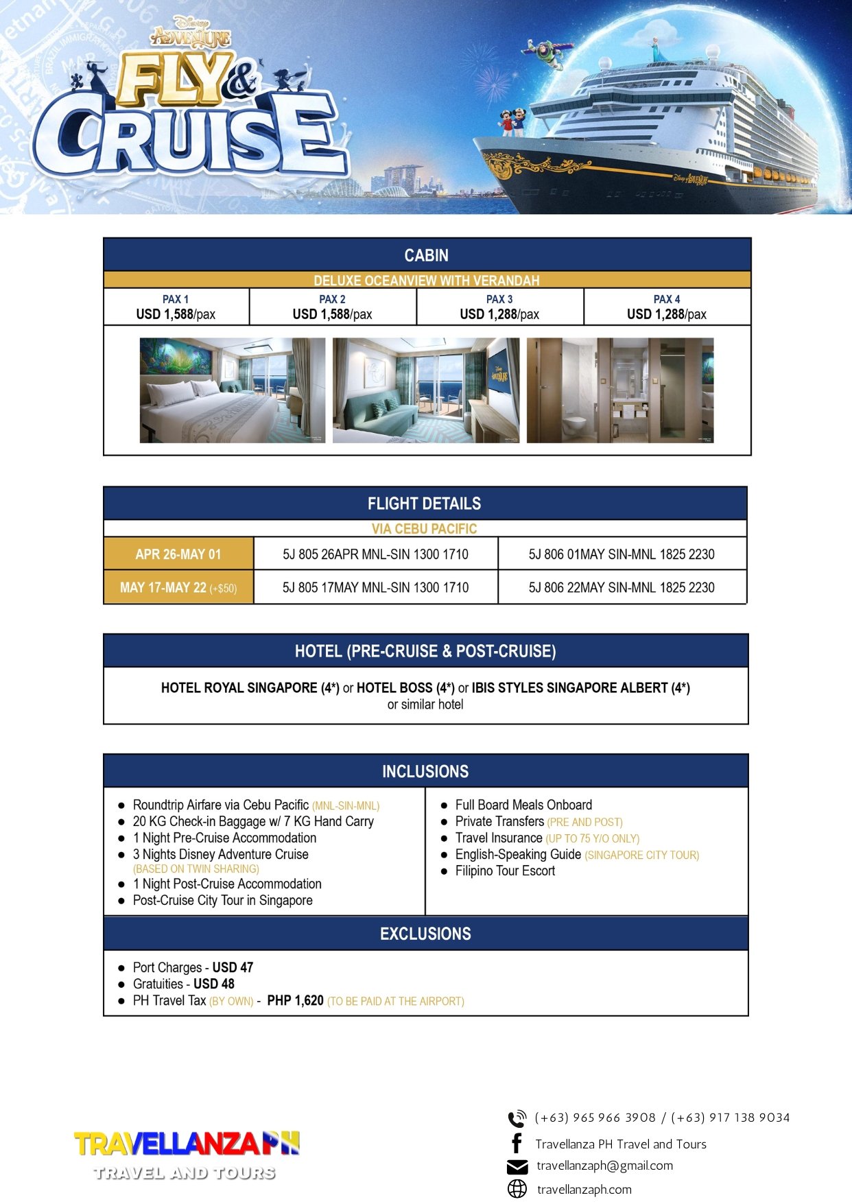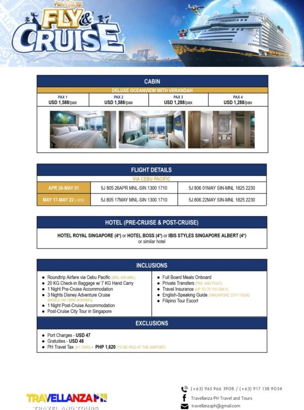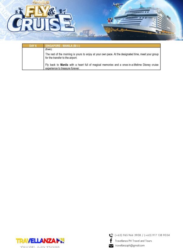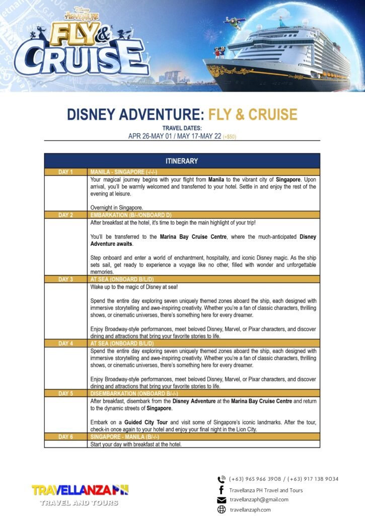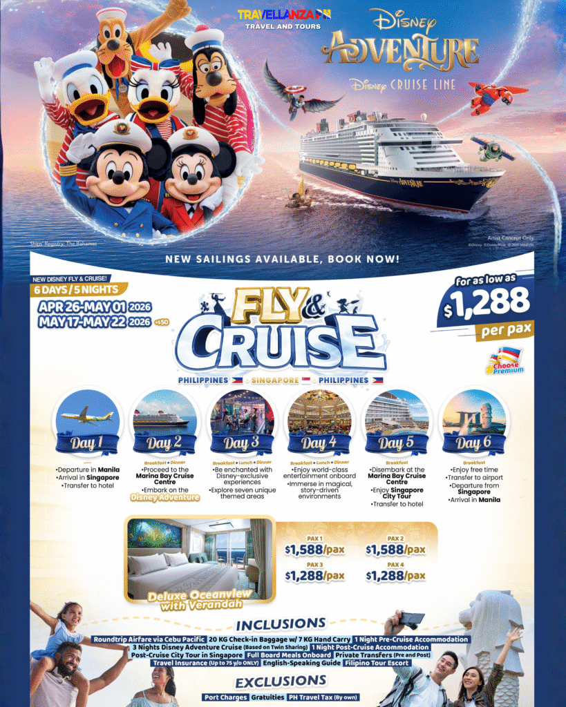 Disney Fly & Cruise 6 Days 5 Nights Overview Overview Go and book your Tour now! Month of Availability!April 26 - May 01 2026May 17 - May 22 2026 +$50 Date & Time Package Type Back Continue You can send your enquiry via the form below. Trip name: * Disney Fly & Cruise Your name: * Your email: * Country * Choose a country*AfghanistanĂ…land IslandsAlbaniaAlgeriaAmerican SamoaAndorraAngolaAnguillaAntarcticaAntigua and BarbudaArgentinaArmeniaArubaAustraliaAustriaAzerbaijanBahamasBahrainBangladeshBarbadosBelarusBelgiumBelauBelizeBeninBermudaBhutanBoliviaBonaire, Saint Eustatius and SabaBosnia and HerzegovinaBotswanaBouvet IslandBrazilBritish Indian Ocean TerritoryBruneiBulgariaBurkina FasoBurundiCambodiaCameroonCanadaCape VerdeCayman IslandsCentral African RepublicChadChileChinaChristmas IslandCocos (Keeling) IslandsColombiaComorosCongo (Brazzaville)Congo (Kinshasa)Cook IslandsCosta RicaCroatiaCubaCuraçaoCyprusCzech RepublicDenmarkDjiboutiDominicaDominican RepublicEcuadorEgyptEl SalvadorEquatorial GuineaEritreaEstoniaEthiopiaFalkland IslandsFaroe IslandsFijiFinlandFranceFrench GuianaFrench PolynesiaFrench Southern TerritoriesGabonGambiaGeorgiaGermanyGhanaGibraltarGreeceGreenlandGrenadaGuadeloupeGuamGuatemalaGuernseyGuineaGuinea-BissauGuyanaHaitiHeard Island and McDonald IslandsHondurasHong KongHungaryIcelandIndiaIndonesiaIranIraqIrelandIsle of ManIsraelItalyIvory CoastJamaicaJapanJerseyJordanKazakhstanKenyaKiribatiKuwaitKyrgyzstanLaosLatviaLebanonLesothoLiberiaLibyaLiechtensteinLithuaniaLuxembourgMacaoNorth MacedoniaMadagascarMalawiMalaysiaMaldivesMaliMaltaMarshall IslandsMartiniqueMauritaniaMauritiusMayotteMexicoMicronesiaMoldovaMonacoMongoliaMontenegroMontserratMoroccoMozambiqueMyanmarNamibiaNauruNepalNetherlandsNew CaledoniaNew ZealandNicaraguaNigerNigeriaNiueNorfolk IslandNorthern Mariana IslandsNorth KoreaNorwayOmanPakistanPalestinian TerritoryPanamaPapua New GuineaParaguayPeruPhilippinesPitcairnPolandPortugalPuerto RicoQatarReunionRomaniaRussiaRwandaSaint BarthélemySaint HelenaSaint Kitts and NevisSaint LuciaSaint Martin (French part)Saint Martin (Dutch part)Saint Pierre and MiquelonSaint Vincent and the GrenadinesSan MarinoSão Tomé and PríncipeSaudi ArabiaSenegalSerbiaSeychellesSierra LeoneSingaporeSlovakiaSloveniaSolomon IslandsSomaliaSouth AfricaSouth Georgia/Sandwich IslandsSouth KoreaSouth SudanSpainSri LankaSudanSurinameSvalbard and Jan MayenSwazilandSwedenSwitzerlandSyriaTaiwanTajikistanTanzaniaThailandTimor-LesteTogoTokelauTongaTrinidad and TobagoTunisiaTurkeyTurkmenistanTurks and Caicos IslandsTuvaluUgandaUkraineUnited Arab EmiratesUnited Kingdom (UK)United States (US)United States (US) Minor Outlying IslandsUruguayUzbekistanVanuatuVaticanVenezuelaVietnamVirgin Islands (British)Virgin Islands (US)Wallis and FutunaWestern SaharaSamoaYemenZambiaZimbabwe Contact number: * No. of Adults * No. of children Enquiry Subject: * Your Message * Show Prices From ₱75,915 / Rate Best Price GuaranteedNo Booking FeesProfessional Local Guide Check Availability ArchivesNo archives to show.CategoriesNo categoriesFeatured Trips ₱1,200 BORACAY ISLAND HOPPING Boracay, Philippines, Daily Tours, Packages 8 Hours ₱2,600 UNDERGROUND RIVER Daily Tours, Puerto princesa city, Palawan 8 Hours ₱2,700 CALAUIT SAFARI WITH BLACK ISLAND TOUR Coron, Palawan, Daily Tours 8 Hours