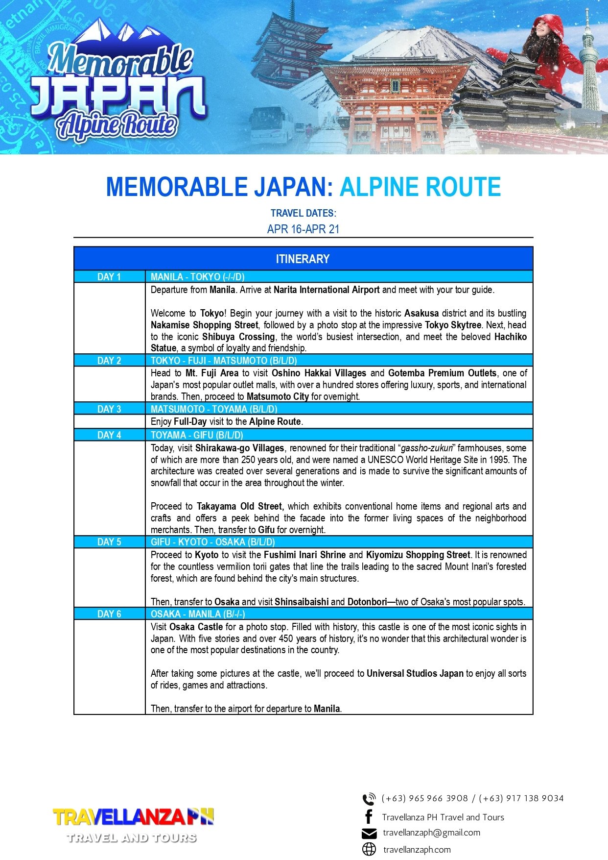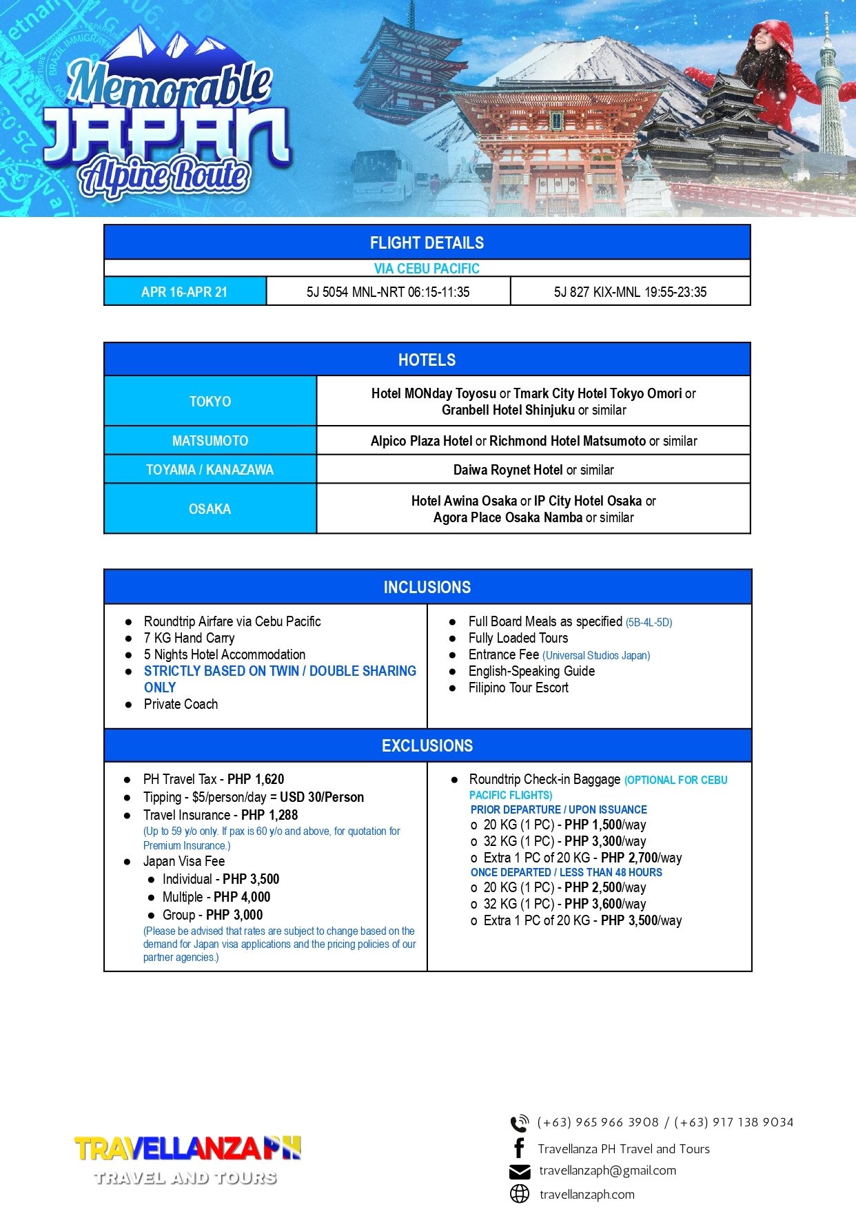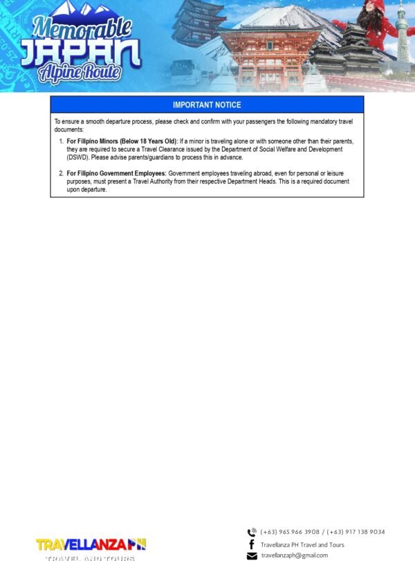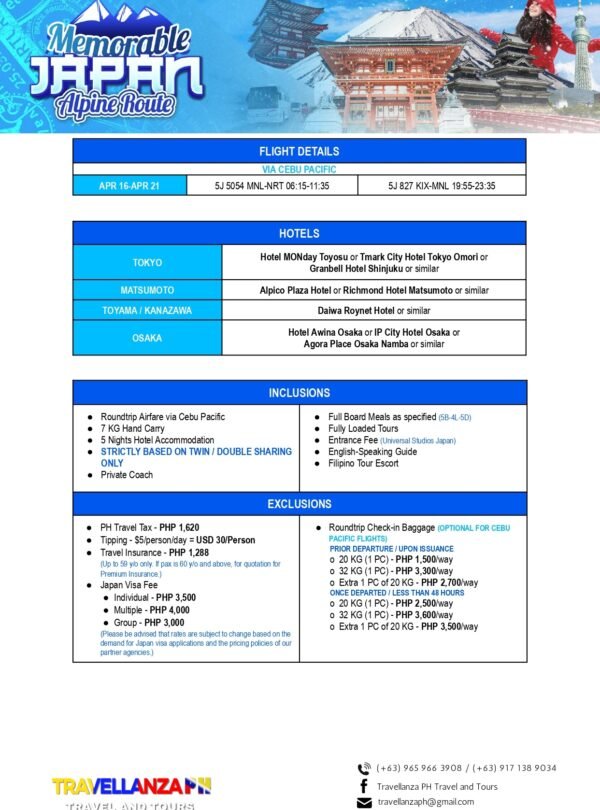 Memorable Japan: Fukuoka 6 Days 5 Nights Overview Overview Go and book your Tour now! Month of Availability!April 16 - April 21 2026 via Cebu Pacific Date & Time Package Type Back Continue You can send your enquiry via the form below. Trip name: * Memorable Japan: Fukuoka Your name: * Your email: * Country * Choose a country*AfghanistanĂ…land IslandsAlbaniaAlgeriaAmerican SamoaAndorraAngolaAnguillaAntarcticaAntigua and BarbudaArgentinaArmeniaArubaAustraliaAustriaAzerbaijanBahamasBahrainBangladeshBarbadosBelarusBelgiumBelauBelizeBeninBermudaBhutanBoliviaBonaire, Saint Eustatius and SabaBosnia and HerzegovinaBotswanaBouvet IslandBrazilBritish Indian Ocean TerritoryBruneiBulgariaBurkina FasoBurundiCambodiaCameroonCanadaCape VerdeCayman IslandsCentral African RepublicChadChileChinaChristmas IslandCocos (Keeling) IslandsColombiaComorosCongo (Brazzaville)Congo (Kinshasa)Cook IslandsCosta RicaCroatiaCubaCuraçaoCyprusCzech RepublicDenmarkDjiboutiDominicaDominican RepublicEcuadorEgyptEl SalvadorEquatorial GuineaEritreaEstoniaEthiopiaFalkland IslandsFaroe IslandsFijiFinlandFranceFrench GuianaFrench PolynesiaFrench Southern TerritoriesGabonGambiaGeorgiaGermanyGhanaGibraltarGreeceGreenlandGrenadaGuadeloupeGuamGuatemalaGuernseyGuineaGuinea-BissauGuyanaHaitiHeard Island and McDonald IslandsHondurasHong KongHungaryIcelandIndiaIndonesiaIranIraqIrelandIsle of ManIsraelItalyIvory CoastJamaicaJapanJerseyJordanKazakhstanKenyaKiribatiKuwaitKyrgyzstanLaosLatviaLebanonLesothoLiberiaLibyaLiechtensteinLithuaniaLuxembourgMacaoNorth MacedoniaMadagascarMalawiMalaysiaMaldivesMaliMaltaMarshall IslandsMartiniqueMauritaniaMauritiusMayotteMexicoMicronesiaMoldovaMonacoMongoliaMontenegroMontserratMoroccoMozambiqueMyanmarNamibiaNauruNepalNetherlandsNew CaledoniaNew ZealandNicaraguaNigerNigeriaNiueNorfolk IslandNorthern Mariana IslandsNorth KoreaNorwayOmanPakistanPalestinian TerritoryPanamaPapua New GuineaParaguayPeruPhilippinesPitcairnPolandPortugalPuerto RicoQatarReunionRomaniaRussiaRwandaSaint BarthélemySaint HelenaSaint Kitts and NevisSaint LuciaSaint Martin (French part)Saint Martin (Dutch part)Saint Pierre and MiquelonSaint Vincent and the GrenadinesSan MarinoSão Tomé and PríncipeSaudi ArabiaSenegalSerbiaSeychellesSierra LeoneSingaporeSlovakiaSloveniaSolomon IslandsSomaliaSouth AfricaSouth Georgia/Sandwich IslandsSouth KoreaSouth SudanSpainSri LankaSudanSurinameSvalbard and Jan MayenSwazilandSwedenSwitzerlandSyriaTaiwanTajikistanTanzaniaThailandTimor-LesteTogoTokelauTongaTrinidad and TobagoTunisiaTurkeyTurkmenistanTurks and Caicos IslandsTuvaluUgandaUkraineUnited Arab EmiratesUnited Kingdom (UK)United States (US)United States (US) Minor Outlying IslandsUruguayUzbekistanVanuatuVaticanVenezuelaVietnamVirgin Islands (British)Virgin Islands (US)Wallis and FutunaWestern SaharaSamoaYemenZambiaZimbabwe Contact number: * No. of Adults * No. of children Enquiry Subject: * Your Message * Show Prices From ₱111,279 / Rate Best Price GuaranteedNo Booking FeesProfessional Local Guide Check Availability ArchivesNo archives to show.CategoriesNo categoriesFeatured Trips ₱1,200 BORACAY ISLAND HOPPING Boracay, Philippines, Daily Tours, Packages 8 Hours ₱2,600 UNDERGROUND RIVER Daily Tours, Puerto princesa city, Palawan 8 Hours ₱2,700 CALAUIT SAFARI WITH BLACK ISLAND TOUR Coron, Palawan, Daily Tours 8 Hours