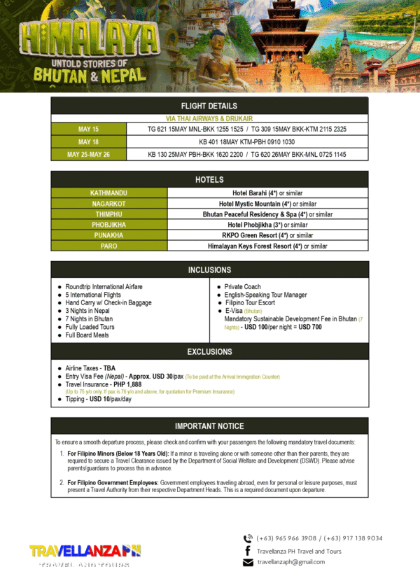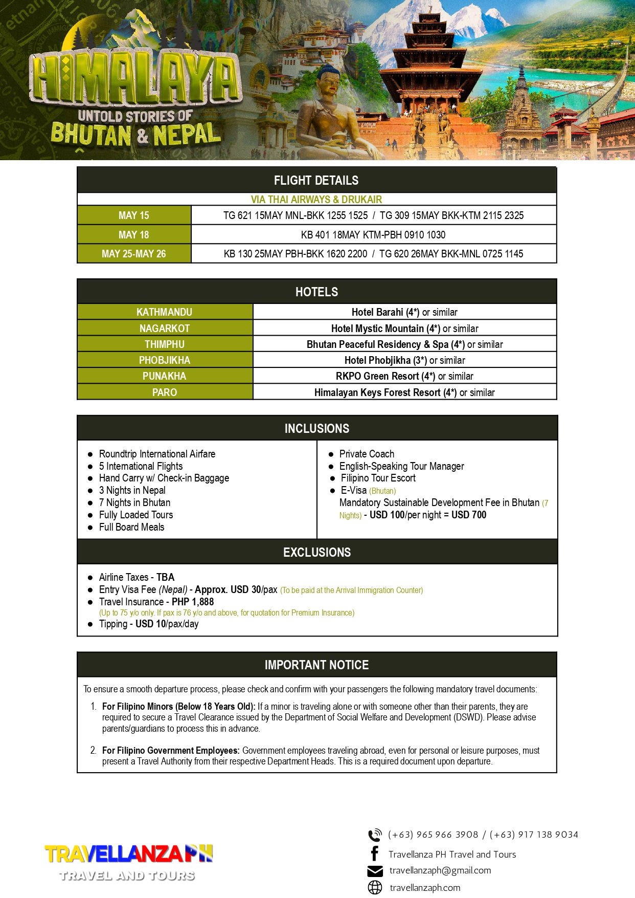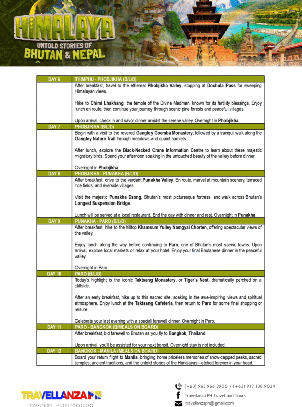Himalaya Untold Stories of Bhutan & Nepal 12 Days 11 Nights Overview Overview This is available for the month of May 15 - 26 2026 Go and book your Tour now! Date & Time Package Type Back Continue You can send your enquiry via the form below. Trip name: * Himalaya Untold Stories of Bhutan & Nepal Your name: * Your email: * Country * Choose a country*AfghanistanĂ…land IslandsAlbaniaAlgeriaAmerican SamoaAndorraAngolaAnguillaAntarcticaAntigua and BarbudaArgentinaArmeniaArubaAustraliaAustriaAzerbaijanBahamasBahrainBangladeshBarbadosBelarusBelgiumBelauBelizeBeninBermudaBhutanBoliviaBonaire, Saint Eustatius and SabaBosnia and HerzegovinaBotswanaBouvet IslandBrazilBritish Indian Ocean TerritoryBruneiBulgariaBurkina FasoBurundiCambodiaCameroonCanadaCape VerdeCayman IslandsCentral African RepublicChadChileChinaChristmas IslandCocos (Keeling) IslandsColombiaComorosCongo (Brazzaville)Congo (Kinshasa)Cook IslandsCosta RicaCroatiaCubaCuraçaoCyprusCzech RepublicDenmarkDjiboutiDominicaDominican RepublicEcuadorEgyptEl SalvadorEquatorial GuineaEritreaEstoniaEthiopiaFalkland IslandsFaroe IslandsFijiFinlandFranceFrench GuianaFrench PolynesiaFrench Southern TerritoriesGabonGambiaGeorgiaGermanyGhanaGibraltarGreeceGreenlandGrenadaGuadeloupeGuamGuatemalaGuernseyGuineaGuinea-BissauGuyanaHaitiHeard Island and McDonald IslandsHondurasHong KongHungaryIcelandIndiaIndonesiaIranIraqIrelandIsle of ManIsraelItalyIvory CoastJamaicaJapanJerseyJordanKazakhstanKenyaKiribatiKuwaitKyrgyzstanLaosLatviaLebanonLesothoLiberiaLibyaLiechtensteinLithuaniaLuxembourgMacaoNorth MacedoniaMadagascarMalawiMalaysiaMaldivesMaliMaltaMarshall IslandsMartiniqueMauritaniaMauritiusMayotteMexicoMicronesiaMoldovaMonacoMongoliaMontenegroMontserratMoroccoMozambiqueMyanmarNamibiaNauruNepalNetherlandsNew CaledoniaNew ZealandNicaraguaNigerNigeriaNiueNorfolk IslandNorthern Mariana IslandsNorth KoreaNorwayOmanPakistanPalestinian TerritoryPanamaPapua New GuineaParaguayPeruPhilippinesPitcairnPolandPortugalPuerto RicoQatarReunionRomaniaRussiaRwandaSaint BarthélemySaint HelenaSaint Kitts and NevisSaint LuciaSaint Martin (French part)Saint Martin (Dutch part)Saint Pierre and MiquelonSaint Vincent and the GrenadinesSan MarinoSão Tomé and PríncipeSaudi ArabiaSenegalSerbiaSeychellesSierra LeoneSingaporeSlovakiaSloveniaSolomon IslandsSomaliaSouth AfricaSouth Georgia/Sandwich IslandsSouth KoreaSouth SudanSpainSri LankaSudanSurinameSvalbard and Jan MayenSwazilandSwedenSwitzerlandSyriaTaiwanTajikistanTanzaniaThailandTimor-LesteTogoTokelauTongaTrinidad and TobagoTunisiaTurkeyTurkmenistanTurks and Caicos IslandsTuvaluUgandaUkraineUnited Arab EmiratesUnited Kingdom (UK)United States (US)United States (US) Minor Outlying IslandsUruguayUzbekistanVanuatuVaticanVenezuelaVietnamVirgin Islands (British)Virgin Islands (US)Wallis and FutunaWestern SaharaSamoaYemenZambiaZimbabwe Contact number: * No. of Adults * No. of children Enquiry Subject: * Your Message * Show Prices From ₱288,099 / Rate Best Price GuaranteedNo Booking FeesProfessional Local Guide Check Availability ArchivesNo archives to show.CategoriesNo categoriesFeatured Trips ₱1,200 BORACAY ISLAND HOPPING Boracay, Philippines, Daily Tours, Packages 8 Hours ₱2,600 UNDERGROUND RIVER Daily Tours, Puerto princesa city, Palawan 8 Hours ₱2,700 CALAUIT SAFARI WITH BLACK ISLAND TOUR Coron, Palawan, Daily Tours 8 Hours