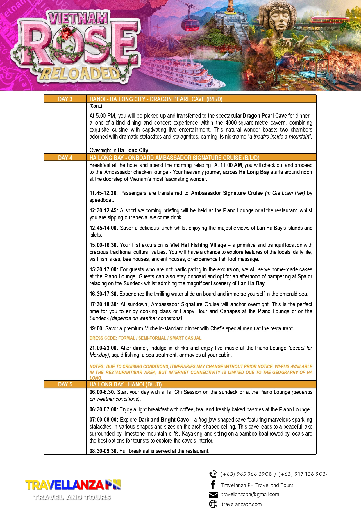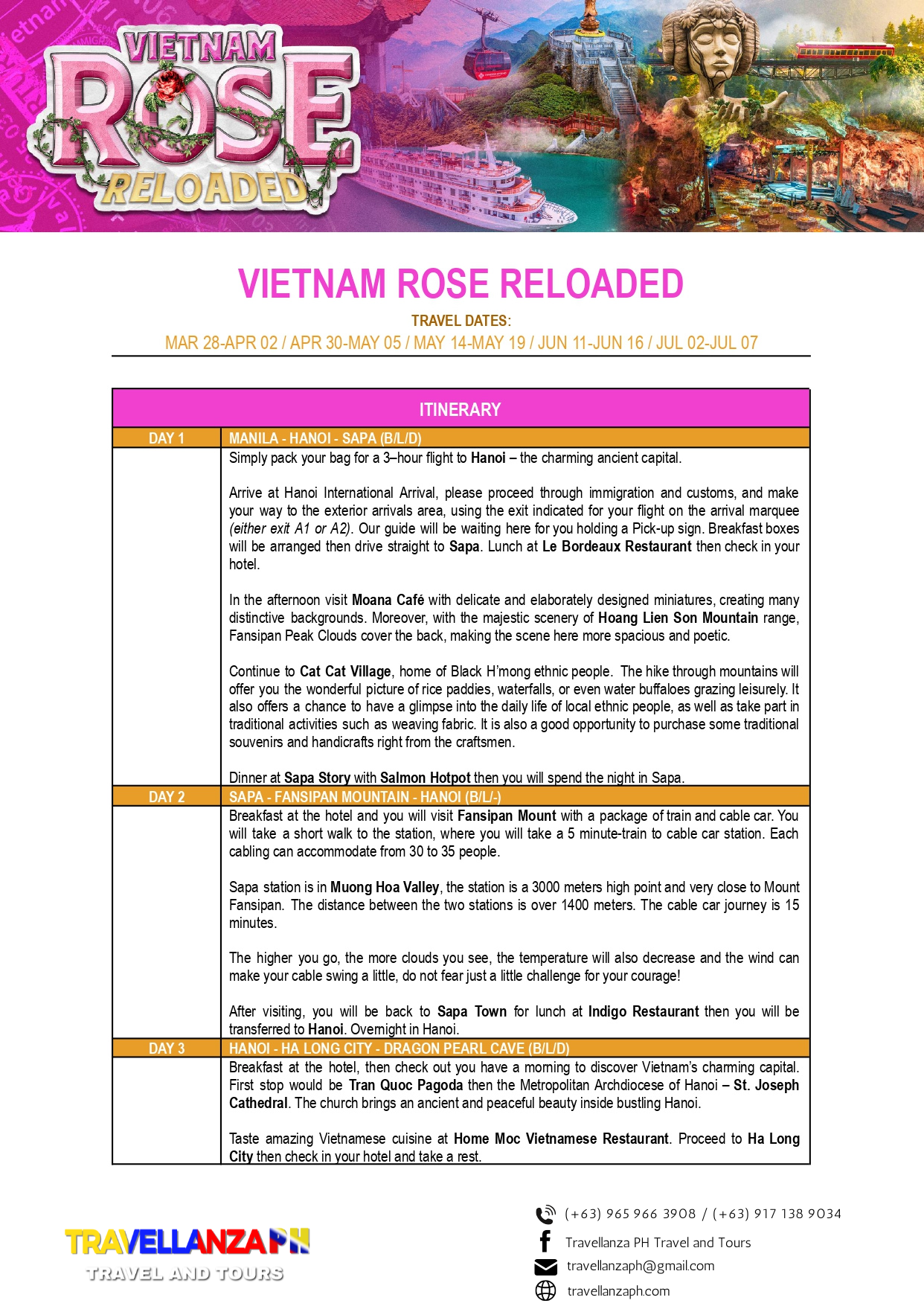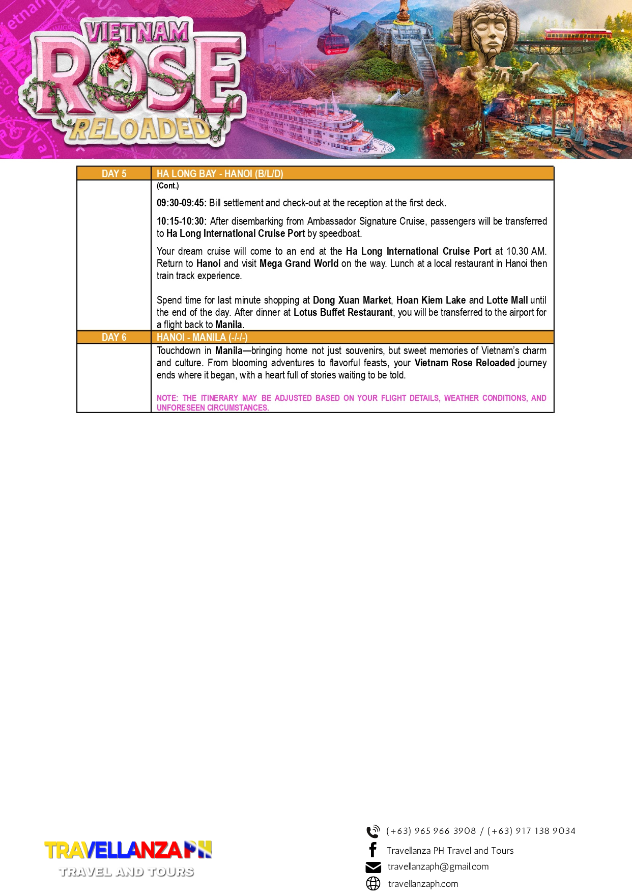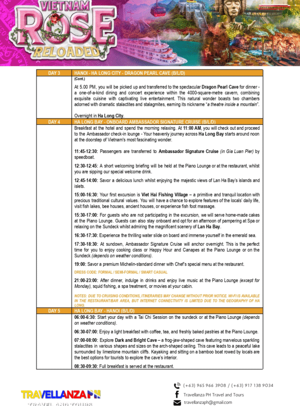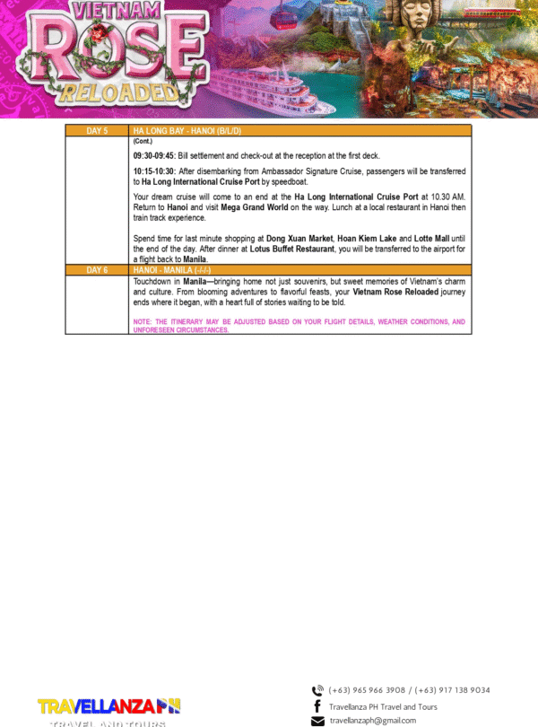 Vietnam Rose Reloaded 6 Days 5 Nights Overview Overview This is available for the month of April 16-21 2026 only Go and book your Tour now! Date & Time Package Type Back Continue You can send your enquiry via the form below. Trip name: * Vietnam Rose Reloaded Your name: * Your email: * Country * Choose a country*AfghanistanĂ…land IslandsAlbaniaAlgeriaAmerican SamoaAndorraAngolaAnguillaAntarcticaAntigua and BarbudaArgentinaArmeniaArubaAustraliaAustriaAzerbaijanBahamasBahrainBangladeshBarbadosBelarusBelgiumBelauBelizeBeninBermudaBhutanBoliviaBonaire, Saint Eustatius and SabaBosnia and HerzegovinaBotswanaBouvet IslandBrazilBritish Indian Ocean TerritoryBruneiBulgariaBurkina FasoBurundiCambodiaCameroonCanadaCape VerdeCayman IslandsCentral African RepublicChadChileChinaChristmas IslandCocos (Keeling) IslandsColombiaComorosCongo (Brazzaville)Congo (Kinshasa)Cook IslandsCosta RicaCroatiaCubaCuraçaoCyprusCzech RepublicDenmarkDjiboutiDominicaDominican RepublicEcuadorEgyptEl SalvadorEquatorial GuineaEritreaEstoniaEthiopiaFalkland IslandsFaroe IslandsFijiFinlandFranceFrench GuianaFrench PolynesiaFrench Southern TerritoriesGabonGambiaGeorgiaGermanyGhanaGibraltarGreeceGreenlandGrenadaGuadeloupeGuamGuatemalaGuernseyGuineaGuinea-BissauGuyanaHaitiHeard Island and McDonald IslandsHondurasHong KongHungaryIcelandIndiaIndonesiaIranIraqIrelandIsle of ManIsraelItalyIvory CoastJamaicaJapanJerseyJordanKazakhstanKenyaKiribatiKuwaitKyrgyzstanLaosLatviaLebanonLesothoLiberiaLibyaLiechtensteinLithuaniaLuxembourgMacaoNorth MacedoniaMadagascarMalawiMalaysiaMaldivesMaliMaltaMarshall IslandsMartiniqueMauritaniaMauritiusMayotteMexicoMicronesiaMoldovaMonacoMongoliaMontenegroMontserratMoroccoMozambiqueMyanmarNamibiaNauruNepalNetherlandsNew CaledoniaNew ZealandNicaraguaNigerNigeriaNiueNorfolk IslandNorthern Mariana IslandsNorth KoreaNorwayOmanPakistanPalestinian TerritoryPanamaPapua New GuineaParaguayPeruPhilippinesPitcairnPolandPortugalPuerto RicoQatarReunionRomaniaRussiaRwandaSaint BarthélemySaint HelenaSaint Kitts and NevisSaint LuciaSaint Martin (French part)Saint Martin (Dutch part)Saint Pierre and MiquelonSaint Vincent and the GrenadinesSan MarinoSão Tomé and PríncipeSaudi ArabiaSenegalSerbiaSeychellesSierra LeoneSingaporeSlovakiaSloveniaSolomon IslandsSomaliaSouth AfricaSouth Georgia/Sandwich IslandsSouth KoreaSouth SudanSpainSri LankaSudanSurinameSvalbard and Jan MayenSwazilandSwedenSwitzerlandSyriaTaiwanTajikistanTanzaniaThailandTimor-LesteTogoTokelauTongaTrinidad and TobagoTunisiaTurkeyTurkmenistanTurks and Caicos IslandsTuvaluUgandaUkraineUnited Arab EmiratesUnited Kingdom (UK)United States (US)United States (US) Minor Outlying IslandsUruguayUzbekistanVanuatuVaticanVenezuelaVietnamVirgin Islands (British)Virgin Islands (US)Wallis and FutunaWestern SaharaSamoaYemenZambiaZimbabwe Contact number: * No. of Adults * No. of children Enquiry Subject: * Your Message * Show Prices From ₱58,888 / Rate Best Price GuaranteedNo Booking FeesProfessional Local Guide Check Availability ArchivesNo archives to show.CategoriesNo categoriesFeatured Trips ₱1,200 BORACAY ISLAND HOPPING Boracay, Philippines, Daily Tours, Packages 8 Hours ₱2,600 UNDERGROUND RIVER Daily Tours, Puerto princesa city, Palawan 8 Hours ₱2,700 CALAUIT SAFARI WITH BLACK ISLAND TOUR Coron, Palawan, Daily Tours 8 Hours